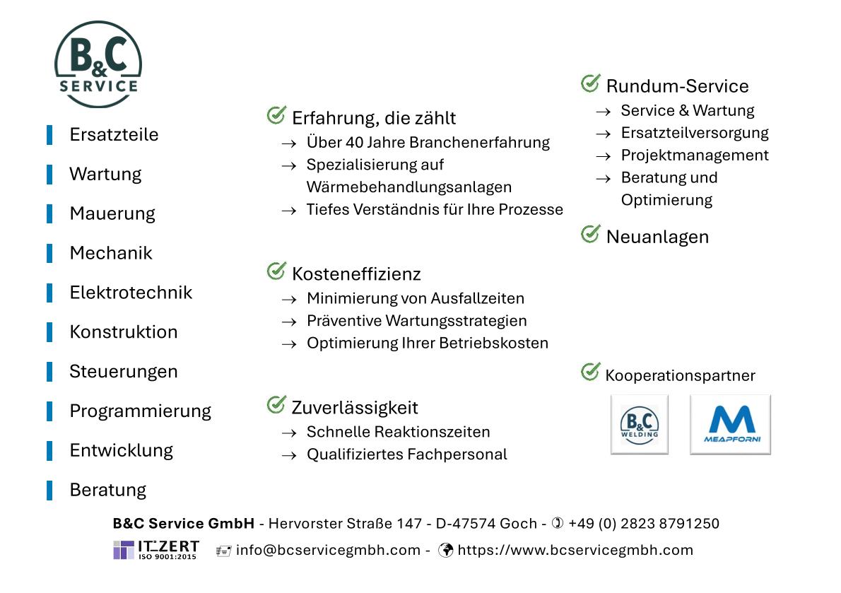 Hierbei liegt unser Fokus auf der nahtlosen Ersatzteilversorgung Ihrer Wärmebehandlungsanlagen, sowie einem einwandfreien Service, regelmäßigen Wartungen und Reparaturen.